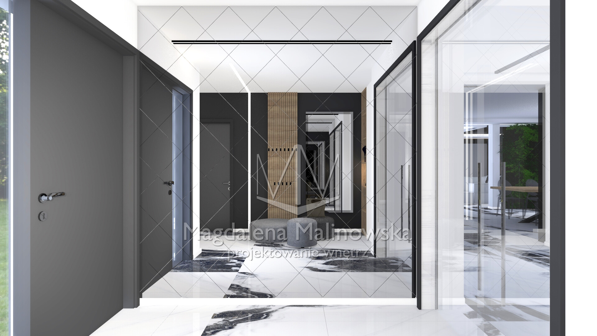 Elegancji nadaje duża ilość przeszkleń, lustra oraz unikalne płytki podłogowe- bardzo wyraziste ale spokojne w połączeniu ze stonowaną resztą robią piorunujące wrażenie.