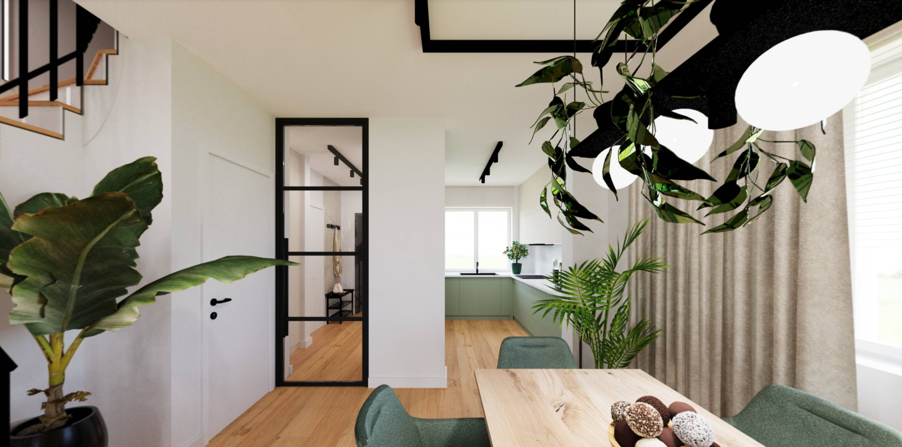 Strefa dzienna zachwyca otwartą przestrzenią, gdzie salon, jadalnia i kuchnia łączą się w naturalny sposób. Drewniany kolor podłogi, zieleń roślin i miękka szarość mebli tworzą przytulny klimat, idealny zarówno do odpoczynku z książką, jak i spotkań z przyjaciółmi. Wielkie okna wpuszczają do wnętrza naturalne światło, a designerskie oświetlenie sufitowe wieczorami tworzy niepowtarzalny nastrój.