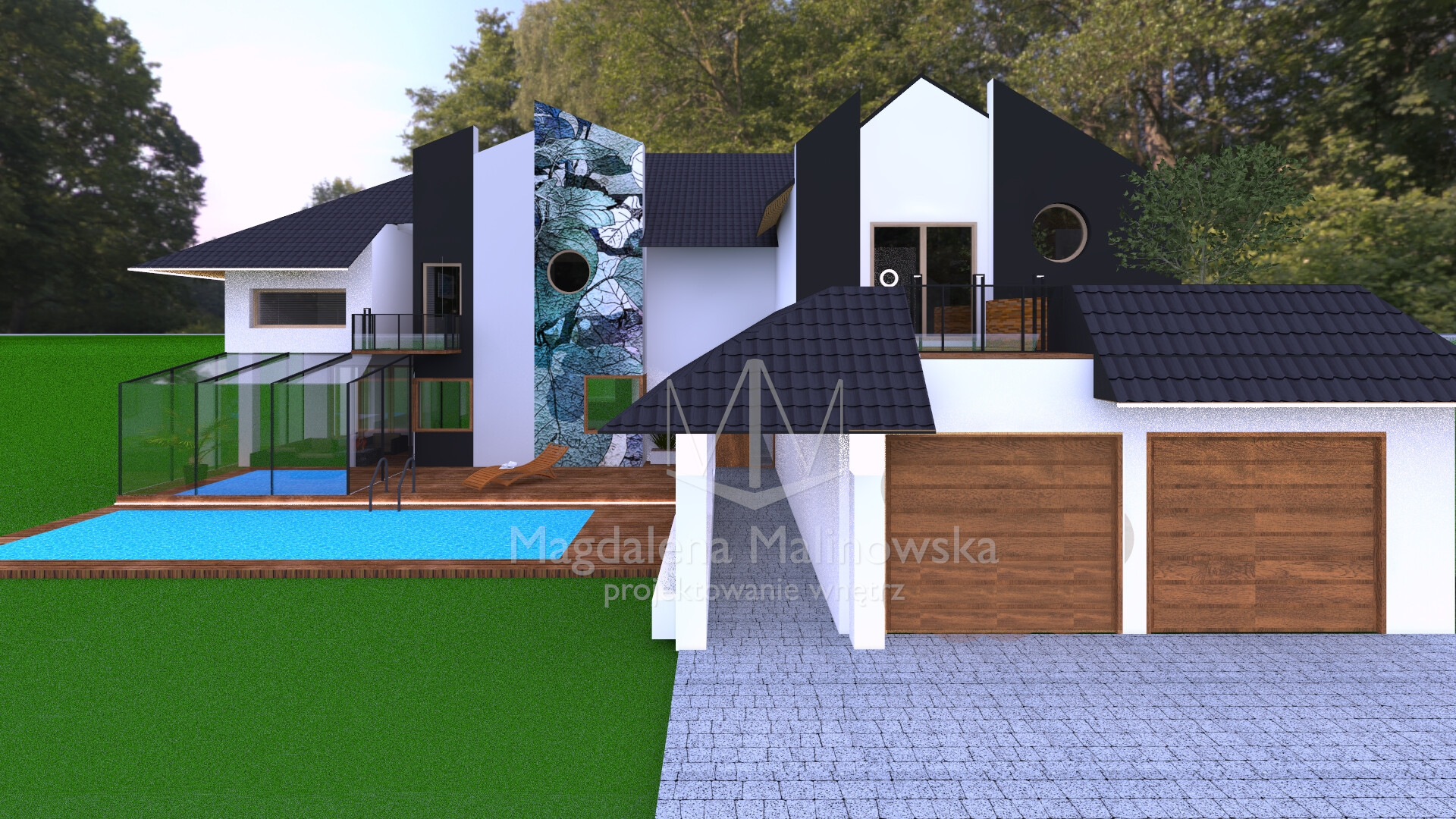Projekt elewacji pięknej willi z basenem oraz ogrodem wertykalnym.