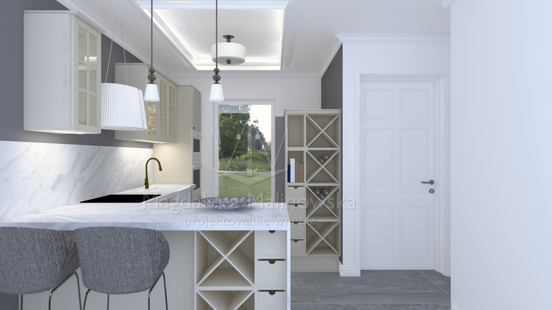 Tutaj przykład iż możliwości projektowe mojego studia nie kończą się na meblach kuchennych robionych pod wymiar, chętnie korzystam z alternatyw jak na przykład tutaj na prośbę klientki w projekt wpisałam kuchnię Ikea Bodbyn.