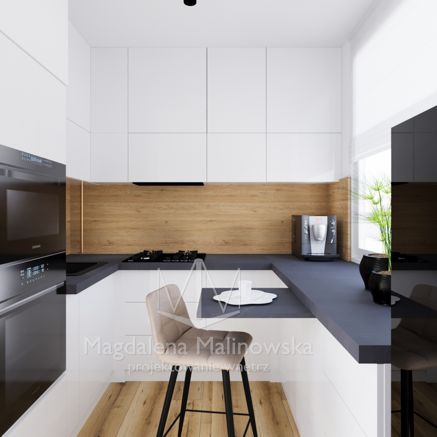 Z pozoru kompaktowa, ta kuchnia została przemyślana tak, by maksymalnie wykorzystać dostępny metraż. Każdy element od zabudowy po rozmieszczenie sprzętów pełni tu swoją rolę. Projekt skupił się na wygodzie codziennego użytkowania, ale nie zapomniał o detalach, które tworzą klimat.