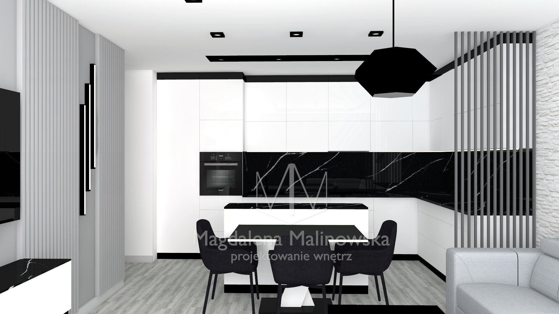 Nowoczesne i eleganckie mieszkanie z nutką glamour, utrzymane w tonacji biało- czarno- szarej.