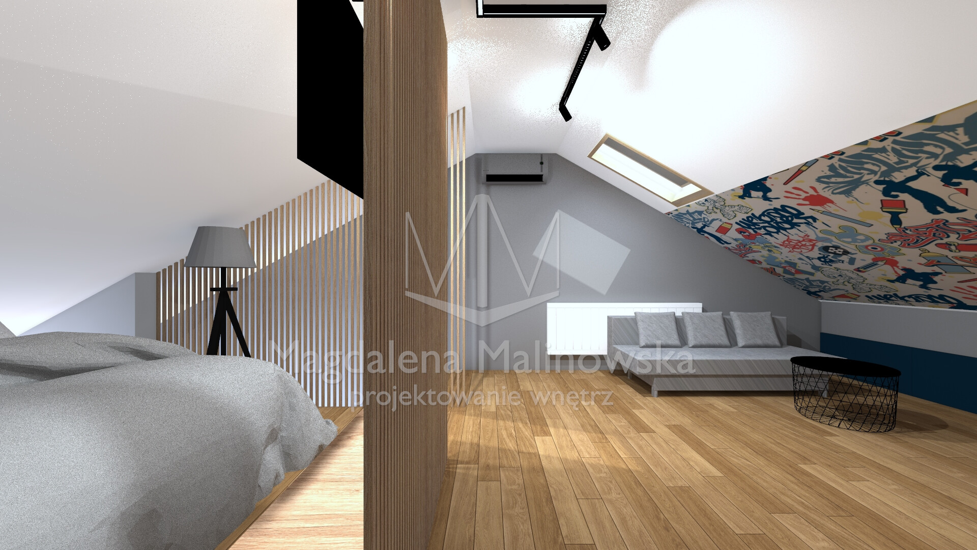 W efekcie mamy strefę do nauki, do odpoczynku z kolegami i zabawy, strefę do spania delikatnie przesłonioną przepierzeniem z lameli.