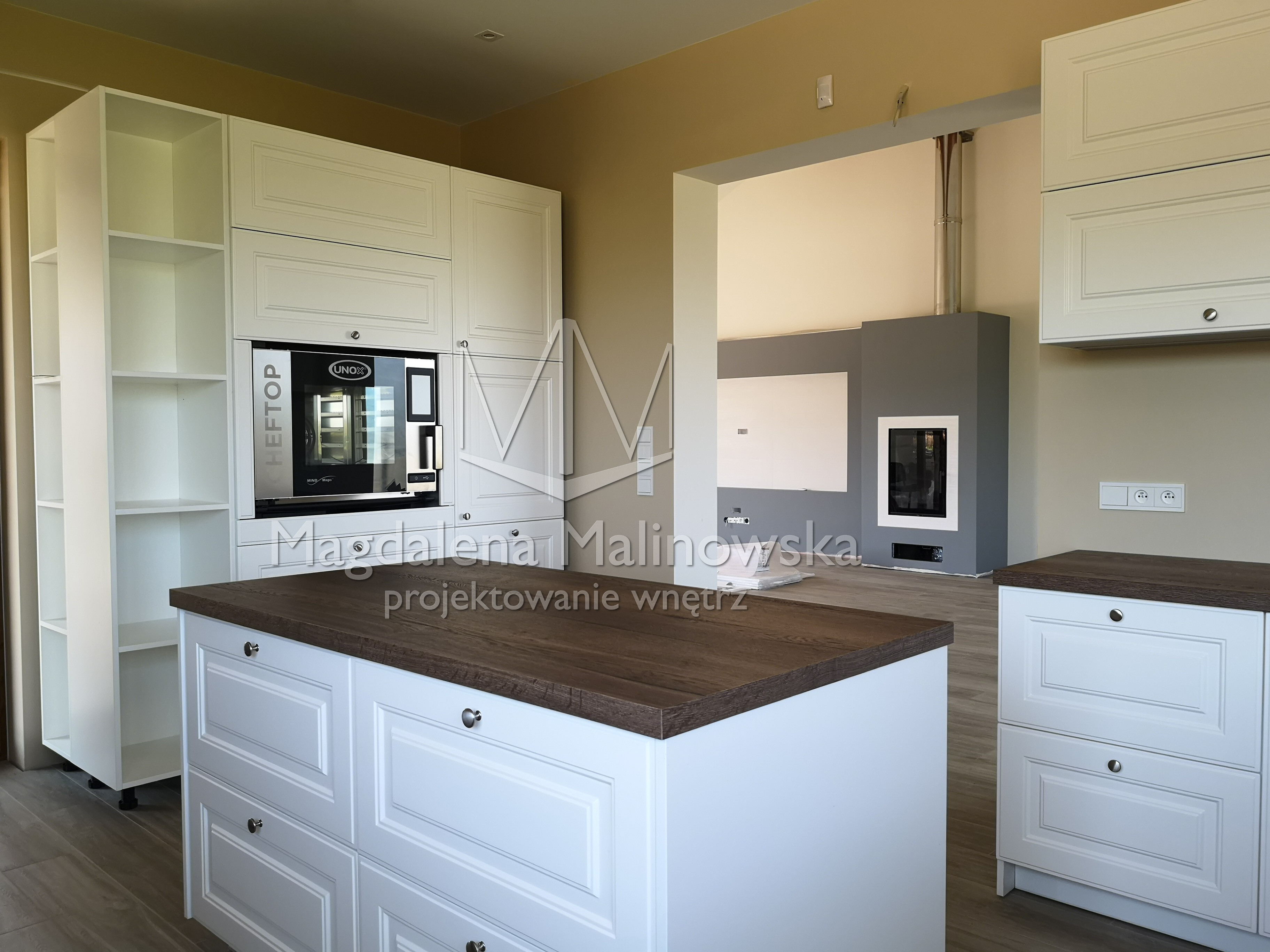Realizacja pięknej, dużej i bardzo wygodnej kuchni, w której mamy mnóstwo sprytnych rozwiązań, jak np. space tower od blum