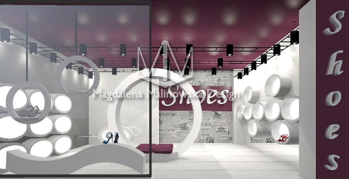 Projekt sklepu obuwniczego z podwieszanym siedziskiem i podświetlanymi gablotami wystawowymi.