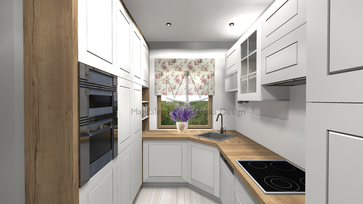 Niewielka kuchnia, w której zaaranżowałam piekarnik we wnęce, natomiast dalej są płytkie szafki zlicowane z zabudową piekarnika.